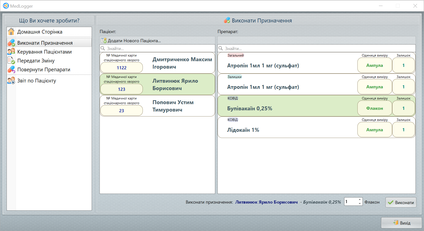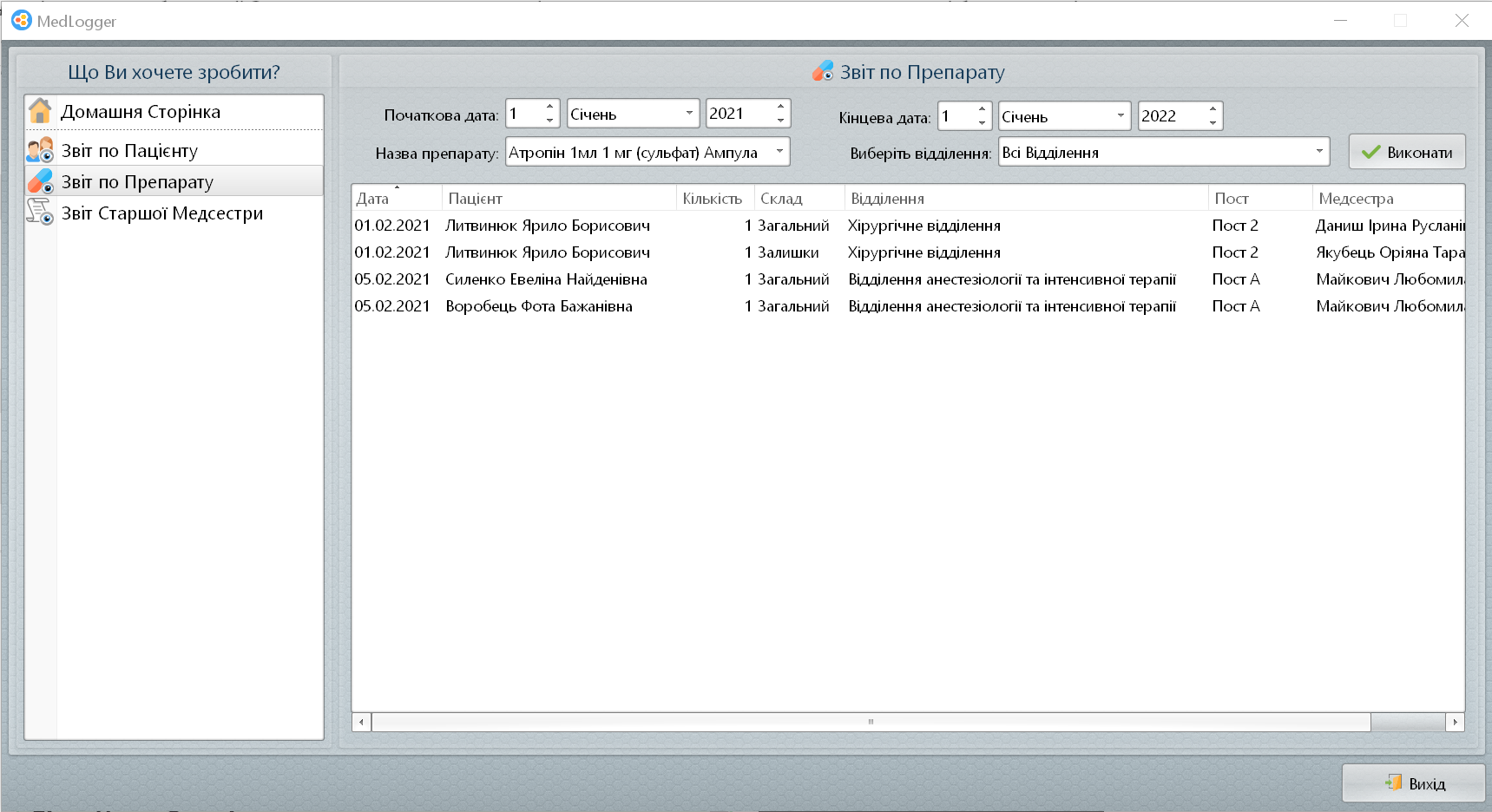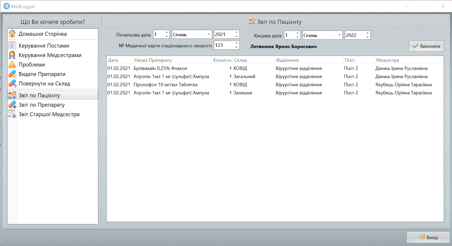 Також, при потребі можна дізнатись, які препарати призначались вказаному пацієнту, а також подивитись повну історію призначень по відділеннях і отримати звіт по використанню певного препарату.