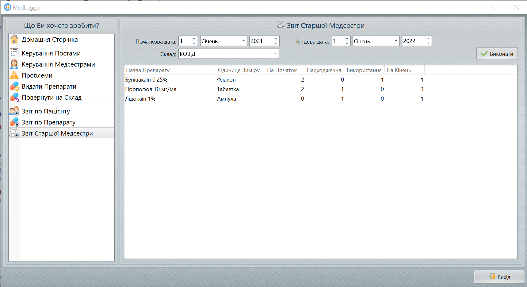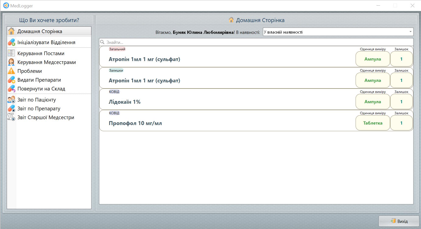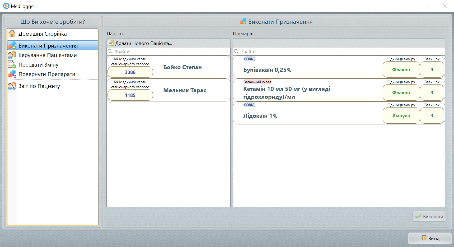 Також, при потребі можна дізнатись, які препарати призначались вказаному пацієнту, а також подивитись повну історію призначень по відділеннях і отримати звіт по використанню певного препарату.